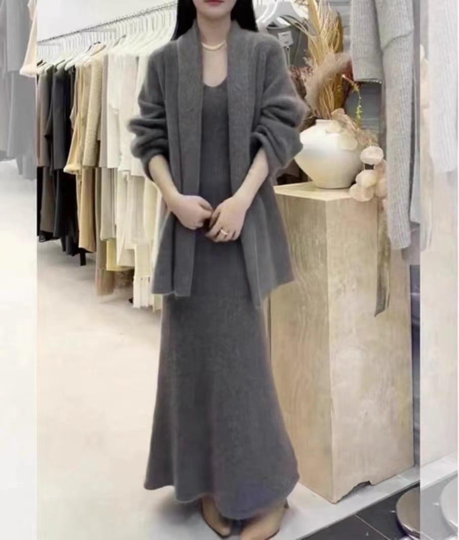 この春秋冬にぴったりな「ニット セットアップ 腰ひも付き カーディガン ワンピース 2点セット」です。シンプルでありながらおしゃれなデザインが魅力で、カーディガンとワンピースがセットで、スタイリングが簡単に決まります。カーディガンは前開きのふわふわ質感で、大人可愛い印象を演出。ワンピースは上品なVネックのマキシ丈で、通勤やデート、普段のお出かけに最適です。これ一着でさまざまなシーンに対応し、着回し力抜群!