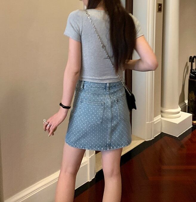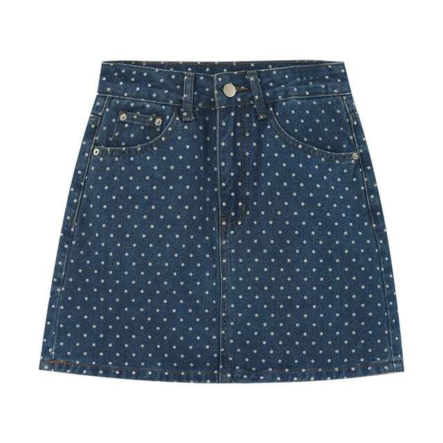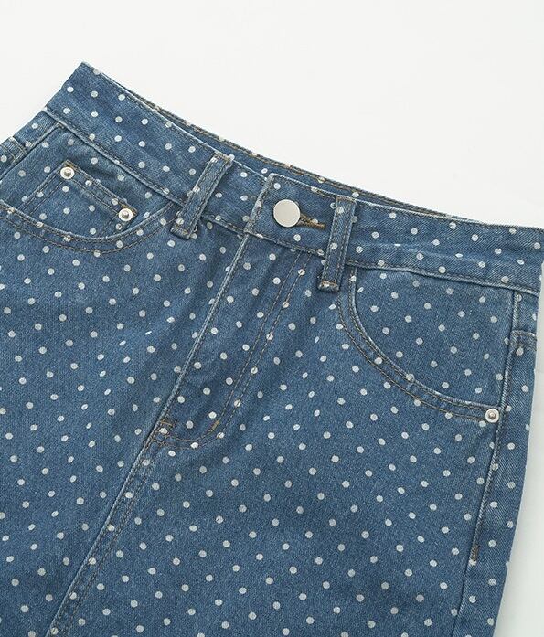 シンプルなブルーデニムにかわいらしい水玉柄が施されたこのスカートは、春夏秋冬を通して活躍し、通勤や学校、デート、お出かけ、旅行、女子会など幅広いシーンでお楽しみいただけます。こなれ感のあるスタイリングで、あなただけの個性的なコーディネートを完成させましょう!