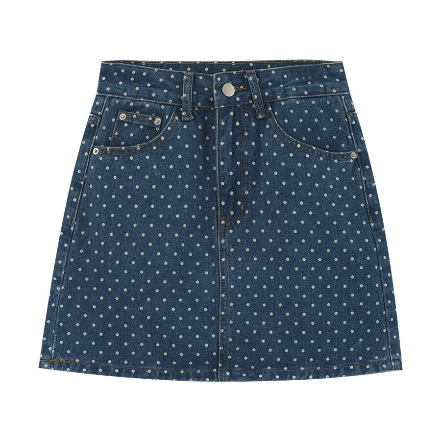 ドット柄 デニム ミニスカート レディース スカート ボトムス ミニ 膝上 スリム 細身 Aライン ファスナー ポケット ハイウエスト ボタン ジッパー チャック ブルーデニム かわいい 大人可愛い きれいめ シンプル カジュアル おしゃれ こなれ感 ガーリー 個性的 主役級 存在感 ドット柄 水玉 春 夏 秋 冬 ママ 通勤 学生 学校 通学 デート お出かけ 旅行 公園 女子会 休日 ショッピング カフェ 美脚 脚長 普段使い 着回し レイヤード S M L 水色 ライトブルー ダークブルー