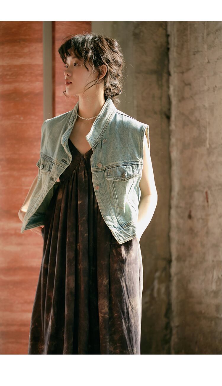 羽織りやすい前開きデザインで、ショート丈とノースリーブスタイルが軽やかさを演出。