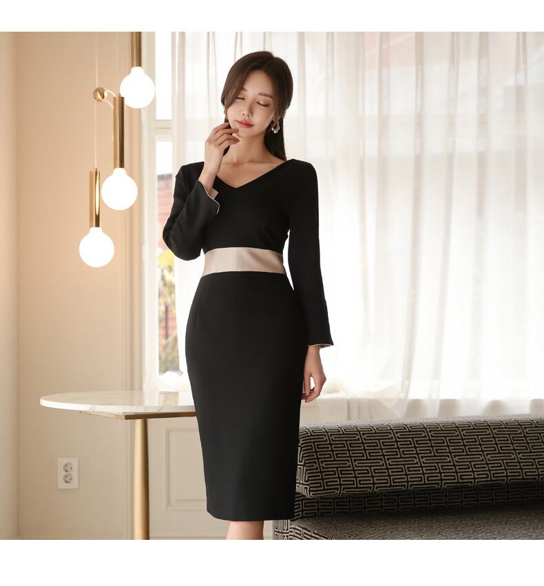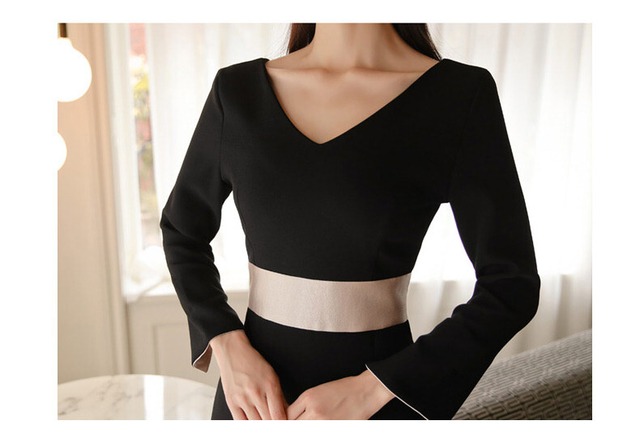 レディース ワンピース 膝丈 膝下 長袖 Vネック タイト スリム 細身 切り替え フェミニン ウエストマーク バックファスナー バックスリット バイカラー 配色 かわいい 大人可愛い きれいめ シンプル カジュアル 上品 おしゃれ こなれ感 エレガント フォーマル 抜け感 無地 春 秋 授業参観 オフィス OL 通勤 学生 学校 通学 デート お出かけ お泊まり パーティー イベント 女子会 休日 高原 ガーデン ショッピング 発表会 カフェ 脚長 普段使い 着回し S M L XL 黒 ブラック