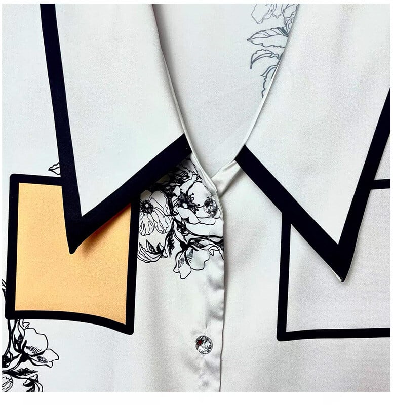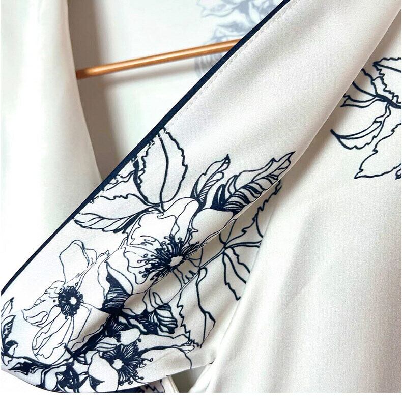 前開きのシャツとボトムスがセットになっており、シンプルでありながら、フェミニンなデザインが魅力的。